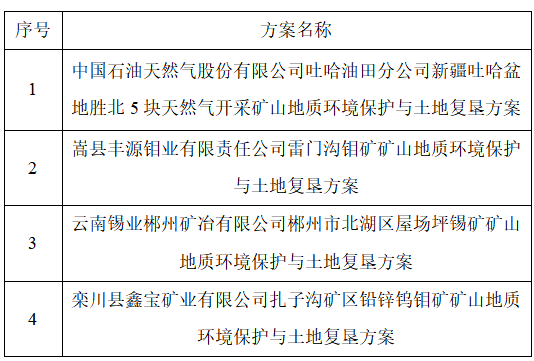 4个拟通过审查的矿山地质环境保护与土地复垦方案名单