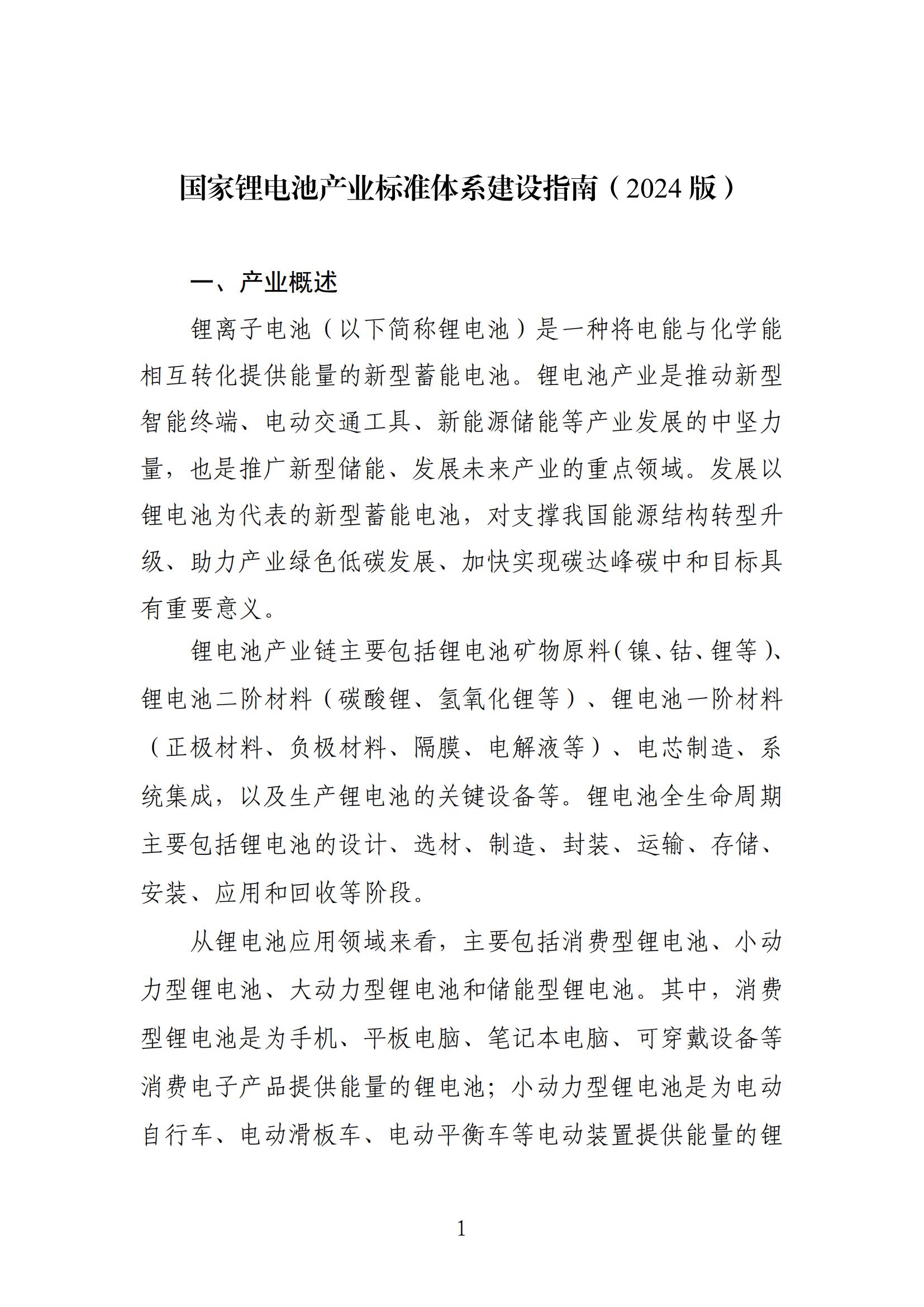 为认真落实《新产业标准化领航工程实施方案(2023-2035年)》,加强锂电池产业标准工作顶层设计,促进锂电池产业健康有序发展,我们组织编制了《国家锂电池产业标准体系建设指南(2024版)》。现印发给你们,请结合实际,抓好贯彻落实。