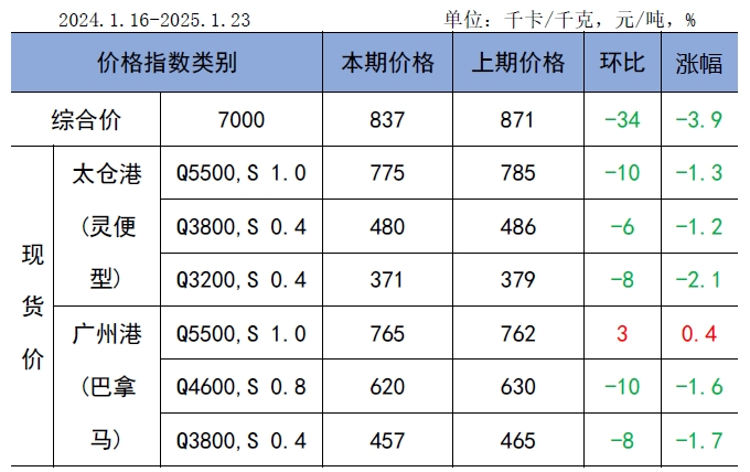 CECI曹妃甸指数1月24日5500千卡/千克、5000千卡/千克和4500千卡/千克平均价格分别为762元/吨、670.2元/吨和582.2元/吨,电煤现货价格小幅下行,各规格品本周价格平均值比上周分别下降10.2元/吨、7.8元/吨和3.8元/吨。现货交易日均总数量基本持平,其中5500千卡/千克数量略有增加,5000千卡/千克样本、4500千卡/千克样本数量略有减少。