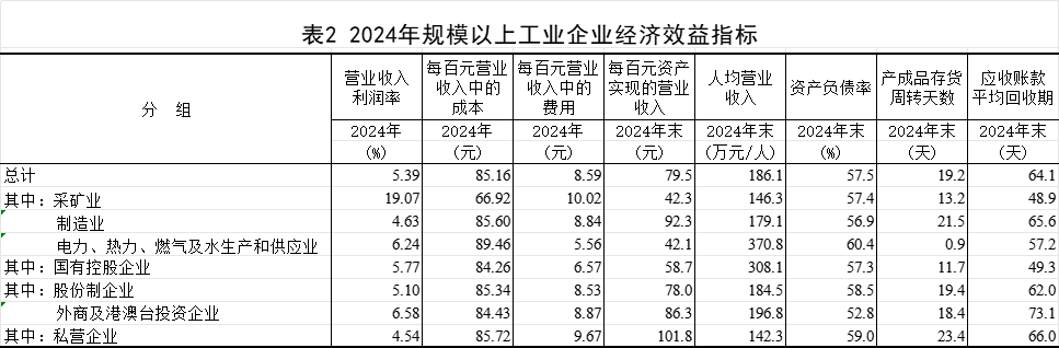 2024年末,规模以上工业企业每百元资产实现的营业收入为79.5元,比上年末减少2.7元;人均营业收入为186.1万元,比上年末增加6.9万元;产成品存货周转天数为19.2天,比上年末增加0.1天;应收账款平均回收期为64.1天,比上年末增加3.9天。