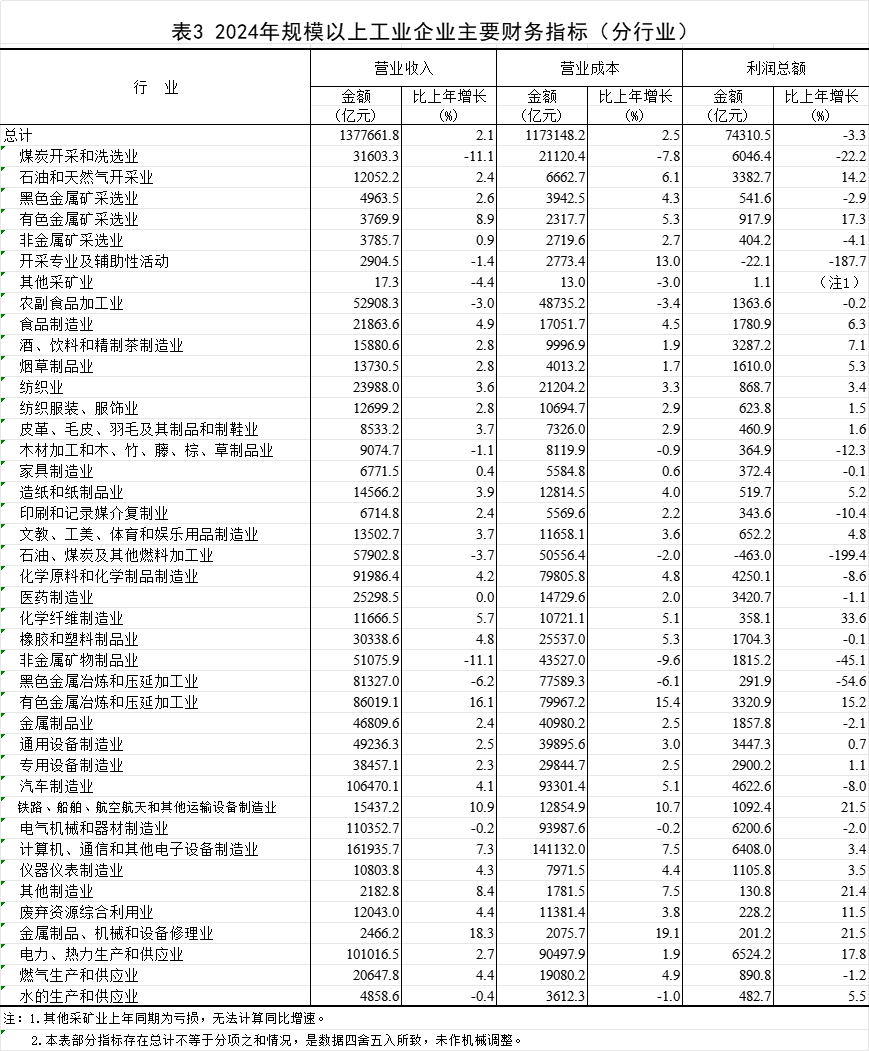 2024年,全国规模以上工业企业实现利润总额74310.5亿元,比上年下降3.3%(按可比口径计算,详见附注二)。