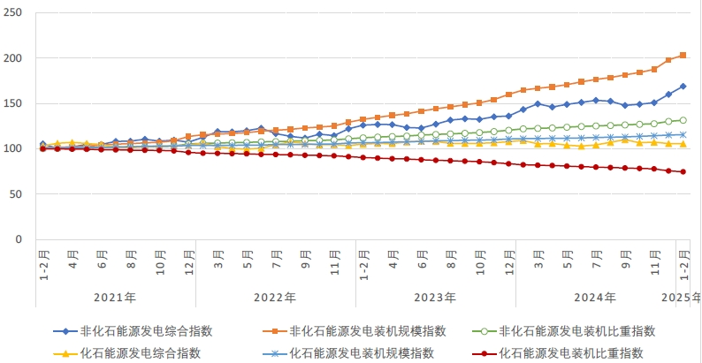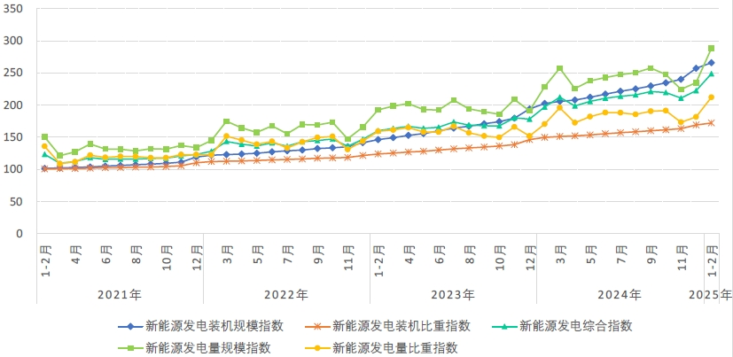1-2月非化石能源发电量规模指数为173.9,比2020年基期增长了73.9%,年均增长11.7%,同比增长16.8%;非化石能源发电量比重指数为127.9,比2020年基期比重增长了27.9%。其中,1-2月新能源发电量规模指数为288.5,比2020年基期增长了188.5%,年均增长23.6%,同比增长26.1%;新能源发电量比重指数为212.2,比2020年基期比重增长了112.2%。