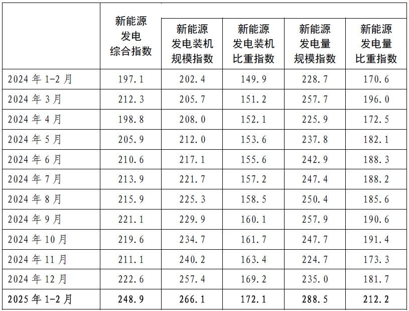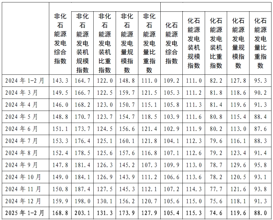 2025年1-2月,全国非化石能源发电综合指数为168.8,比2020年基期(以2020年基期为100)增长了68.8%,同比增长17.8%;其中,新能源发电综合指数为248.9,比2020年基期增长了148.9%,同比增长26.3%。在“双碳”目标引领下,非化石能源及其新能源发电综合指数保持快速增长态势。其中: