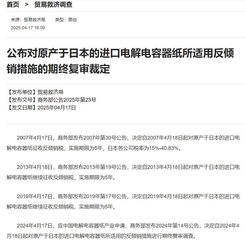 商务部根据调查结果向国务院关税税则委员会提出继续实施反倾销措施的建议,国务院关税税则委员会根据商务部的建议作出决定,自2025年4月18日起,对原产于日本的进口电解电容器纸继续征收反倾销税,实施期限为5年。