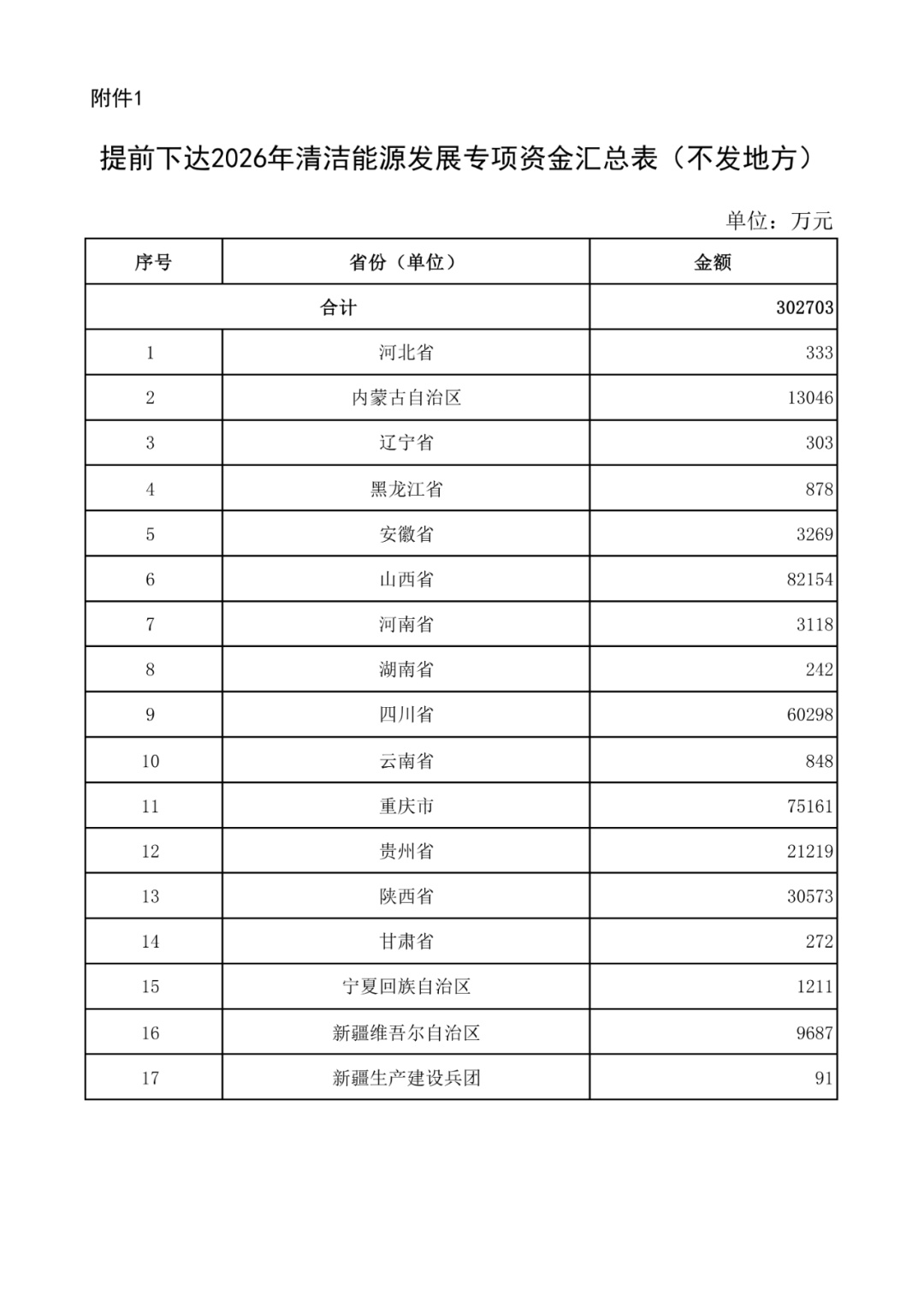 附件:1.提前下达2026年清洁能源发展专项资金汇总表(不发地方)