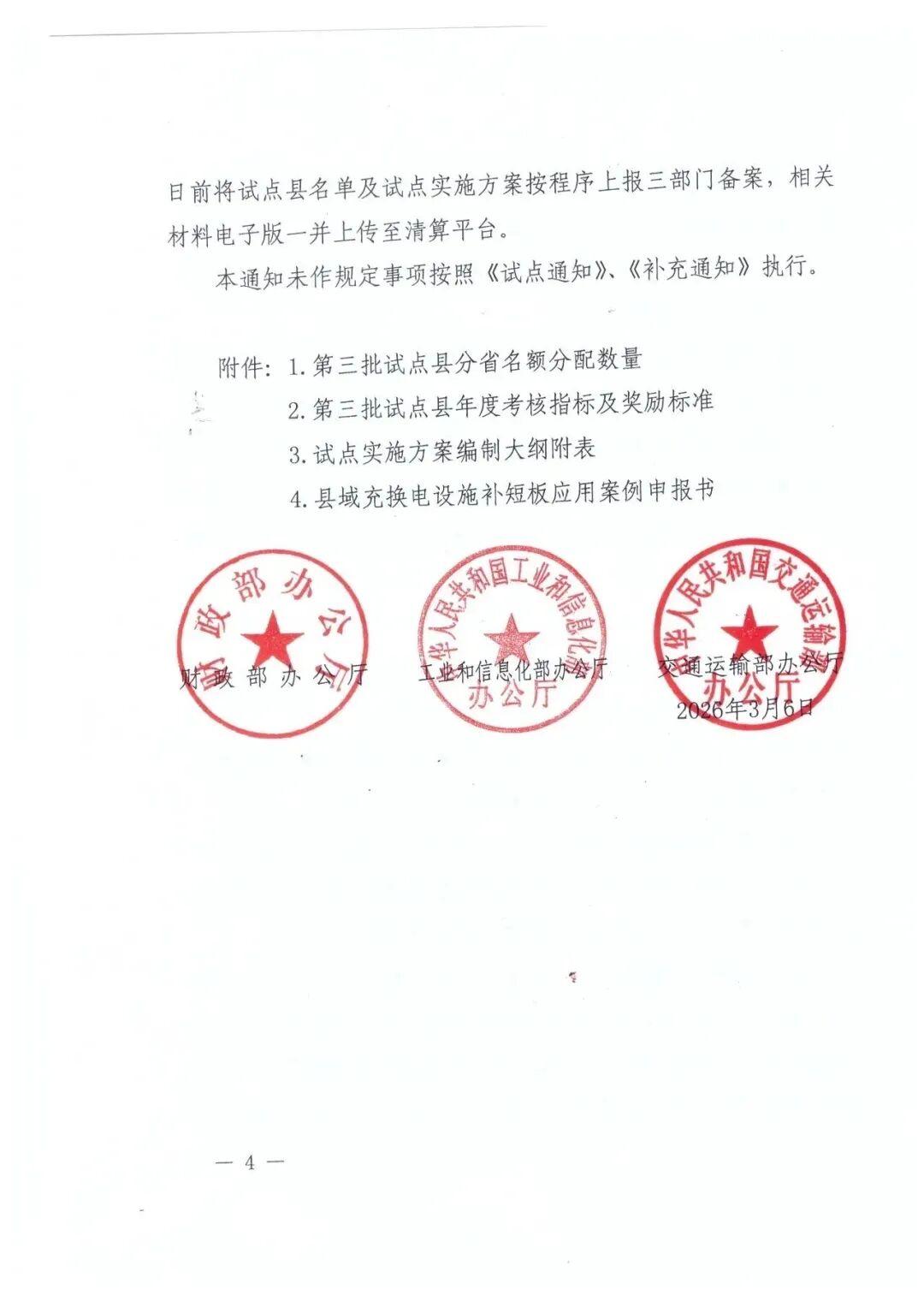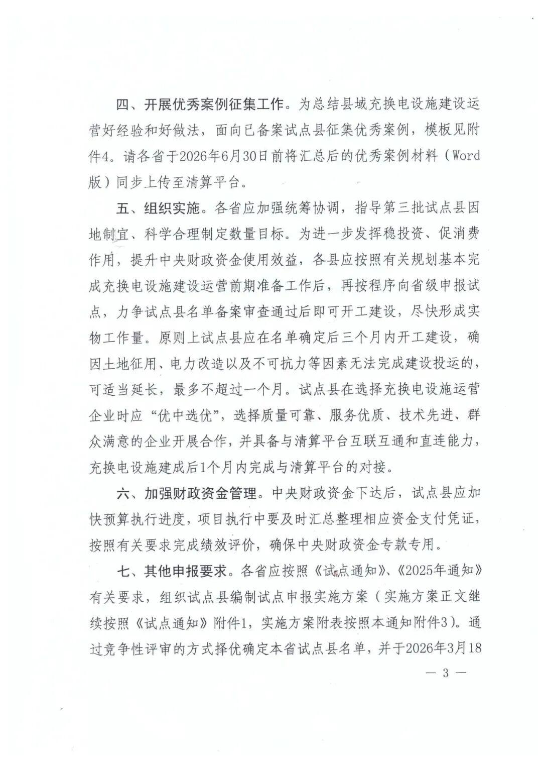 财政部、工信部、交通运输部三部门近日联合印发《关于开展2026年县域充换电设施补短板试点申报有关工作的通知》。