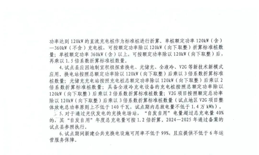 《通知》提出,鼓励绿电应用。贯彻落实中央经济工作会议关于扩大绿电应用的决策部署,对于通过光伏发电的充换电场站,“自发自用”电量超过总充电量40%的,其“自发自用”年度总充电量可按1.2倍折算。2024-2025年通过备案的试点县参照执行。