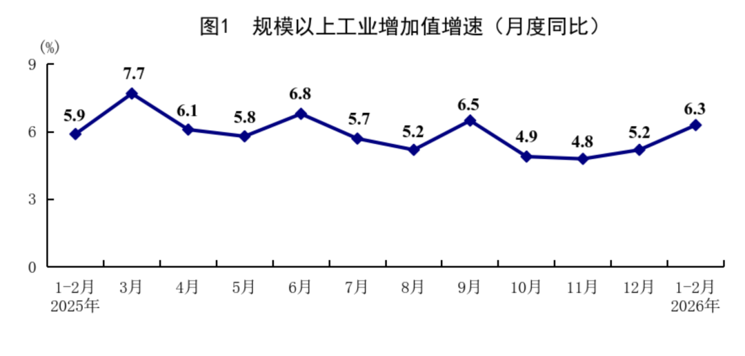 1—2月份,全国规模以上工业增加值同比增长6.3%,比上年12月份加快1.1个百分点。分三大门类看,采矿业增加值同比增长6.1%,制造业增长6.6%,电力、热力、燃气及水生产和供应业增长4.7%。装备制造业增加值同比增长9.3%,高技术制造业增加值增长13.1%,分别快于全部规模以上工业增加值3.0和6.8个百分点。分经济类型看,国有控股企业增加值同比增长4.2%;股份制企业增长6.9%,外商及港澳台投资企业增长4.0%;私营企业增长7.4%。分产品看,3D打印设备、锂离子电池、工业机器人产品产量同比分别增长54.1%、42.6%、31.1%。从环比看,2月份规模以上工业增加值比上月增长0.83%。2月份,制造业采购经理指数为49.0%;企业生产经营活动预期指数为53.2%,比上月上升0.6个百分点。