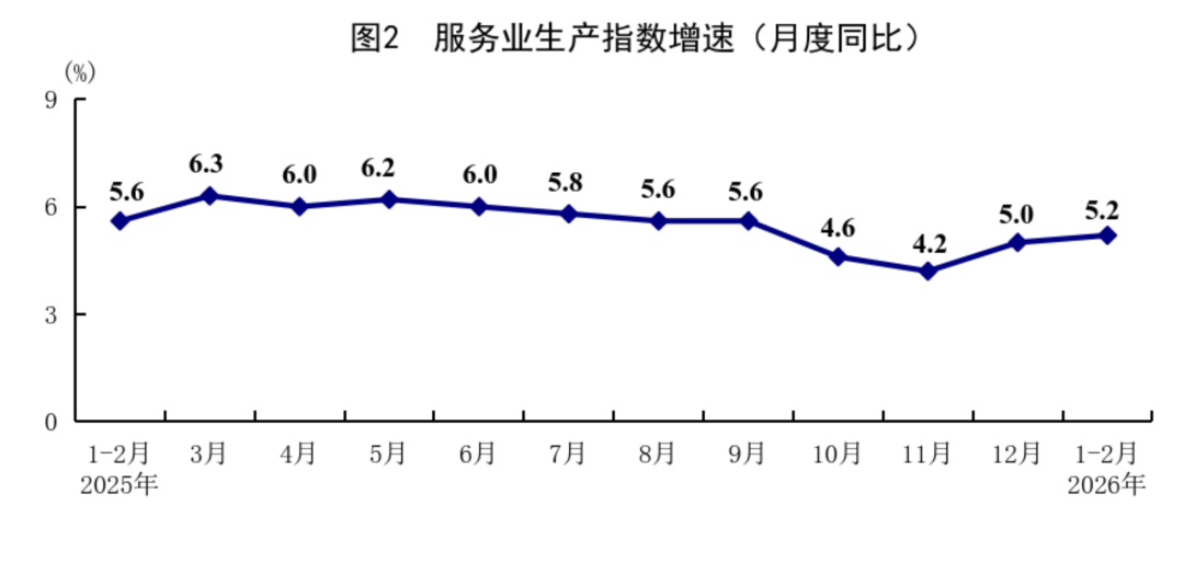 1—2月份,全国服务业生产指数同比增长5.2%,比上年12月份加快0.2个百分点。分行业看,信息传输、软件和信息技术服务业,租赁和商务服务业,金融业,交通运输、仓储和邮政业,住宿和餐饮业生产指数分别增长10.1%、8.2%、7.0%、6.3%、5.4%。2月份,服务业商务活动指数为49.7%,比上月上升0.2个百分点;服务业业务活动预期指数为55.8%。其中,住宿、餐饮、文化体育娱乐等行业商务活动指数位于60.0%以上高位景气区间。