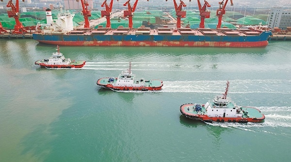 4月17日,纯电动拖轮“云港电拖三号”正式交付连云港港口集团。该拖轮将与之前投用的“云港电拖一号”“云港电拖二号”组队协同作业,这也标志着全国首支纯电拖轮船队组建完成。3艘纯电拖轮组队配合,总功率达11040千瓦,可完成各类船舶的进出港口等作业。据测算,纯电拖轮的年综合运营成本较同马力传统燃油拖轮节省近300万元、减少碳排放近900吨。