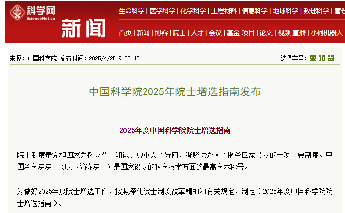 ▲科学网《2025年度中国科学院院士增选指南》截图