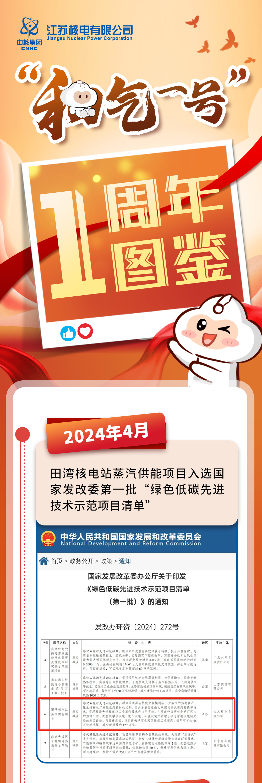 “和气一号”作为国家首批“绿色低碳先进技术示范工程”,已获实用新型专利1项、发明专利5项,发布标准2项,发表专著论文2篇。在取得成绩的同时,背后还有一笔环保共赢的绿色生态账:“和气一号”投产一年来,为连云港石化产业基地输送超317万吨的清洁蒸汽,相当于减少燃烧标准煤26.42万吨,等效减排二氧化碳70.66万吨、二氧化硫121.51吨、氮氧化物173.69吨,为连云港石化产业基地节省碳排放指标46.23万吨。