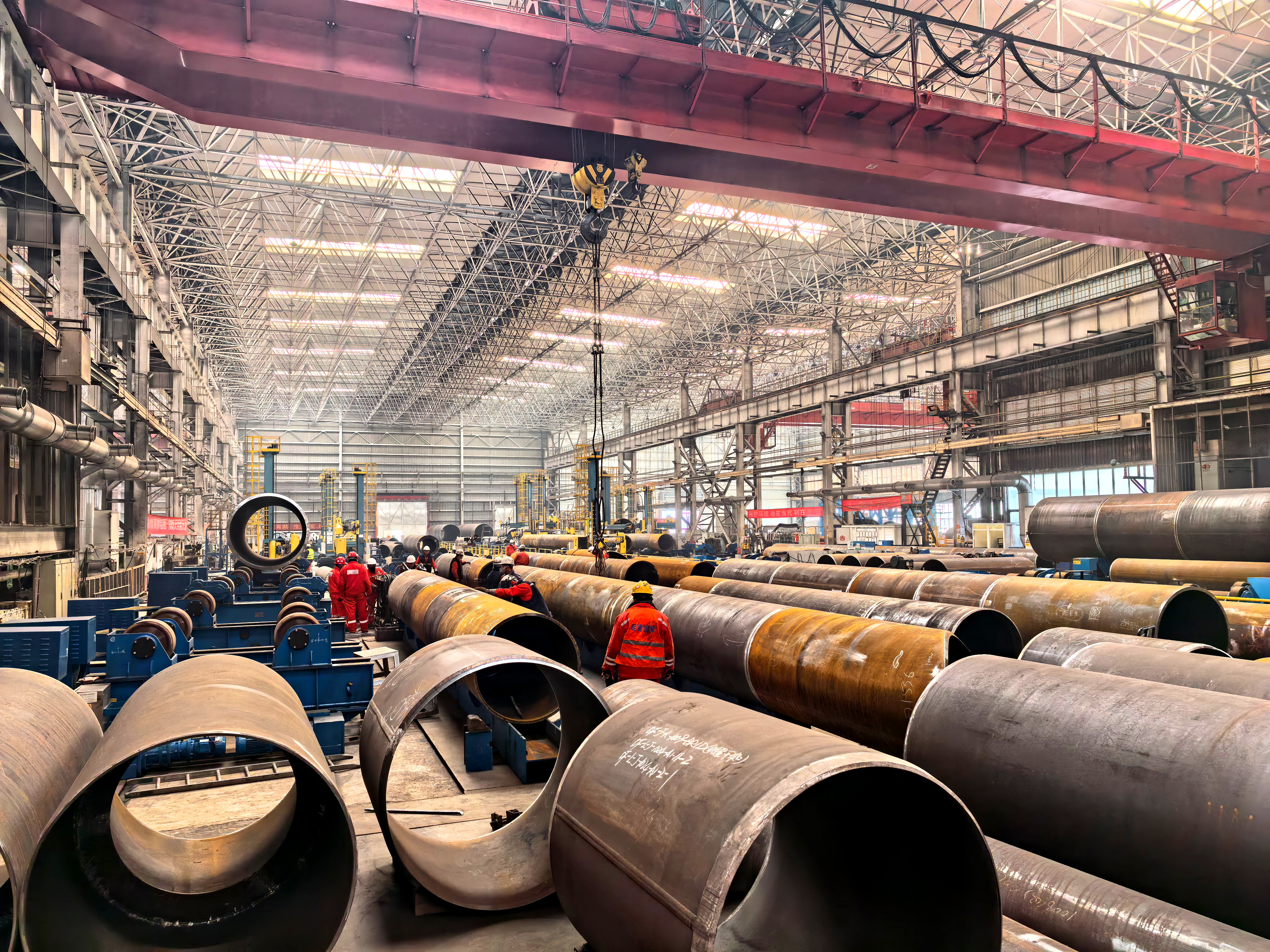 项目的钢结构预制工作在海油工程青岛国际化高端装备制造基地制管车间展开,施工人员正在进行结构钢管的上料工作。(牛天军摄)