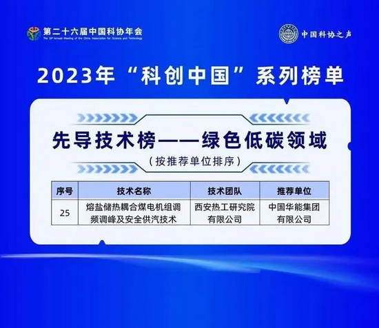 7月2日,中国科学技术协会在第二十六届中国科协年会上发布了“科创中国”系列榜单。中国华能所属西安热工院研发的“熔盐储热耦合煤电机组调频调峰及安全供汽技术”成功入选2023年“科创中国”先导技术榜。