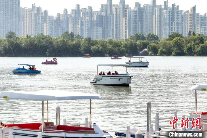 10月7日,游客在天津水上公园体验无人驾驶智能游艇。近日,天津首批15条智能游艇在天津水上公园投用,该船总长6.2米,智能中控系统可以提供电子围栏、北斗定位、智能驾驶、5G通信、语音提示和多维感知功能,可实现智能辅助驾驶和人工驾驶自由切换,自动出港、手动航行、自动进港、自动停靠并锁船。中新社记者 佟郁 摄
