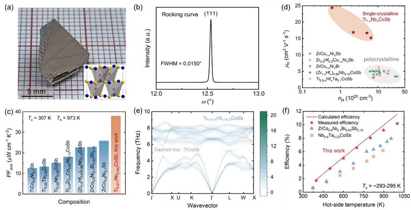 其中,科研团队发现铌元素掺杂的TiCoSb单晶的载流子迁移率为同体系多晶材料的2倍至3倍。
