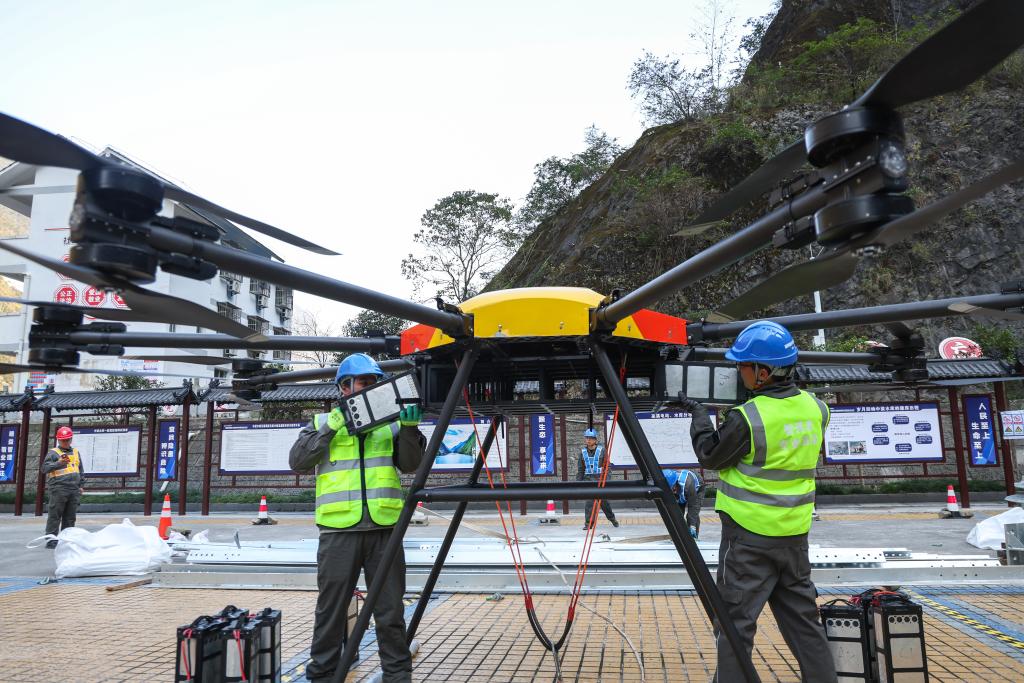 11月27日,在重庆市巫溪县中梁乡35千伏西土线改造现场,现场工作人员操作重载无人机吊运新建铁塔塔材。新华社记者黄伟摄