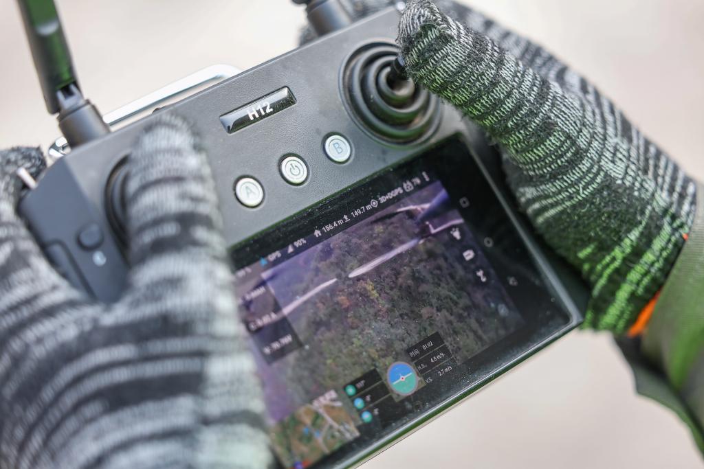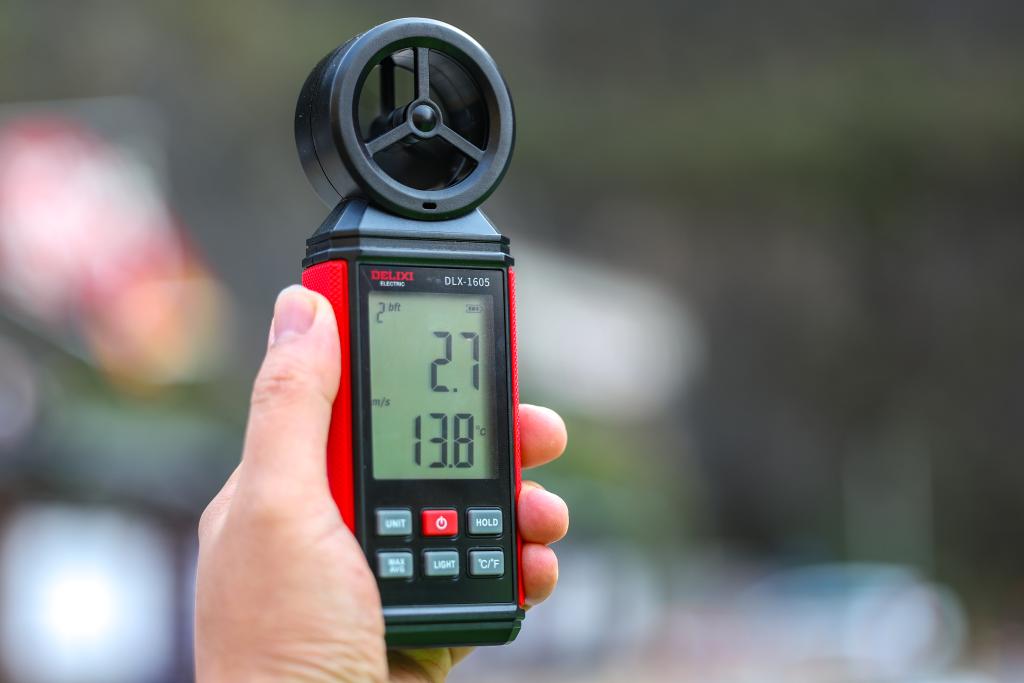 11月27日,在重庆市巫溪县中梁乡35千伏西土线改造现场,现场工作人员利用风速测量仪监测无人机起降的作业条件。新华社记者黄伟摄
