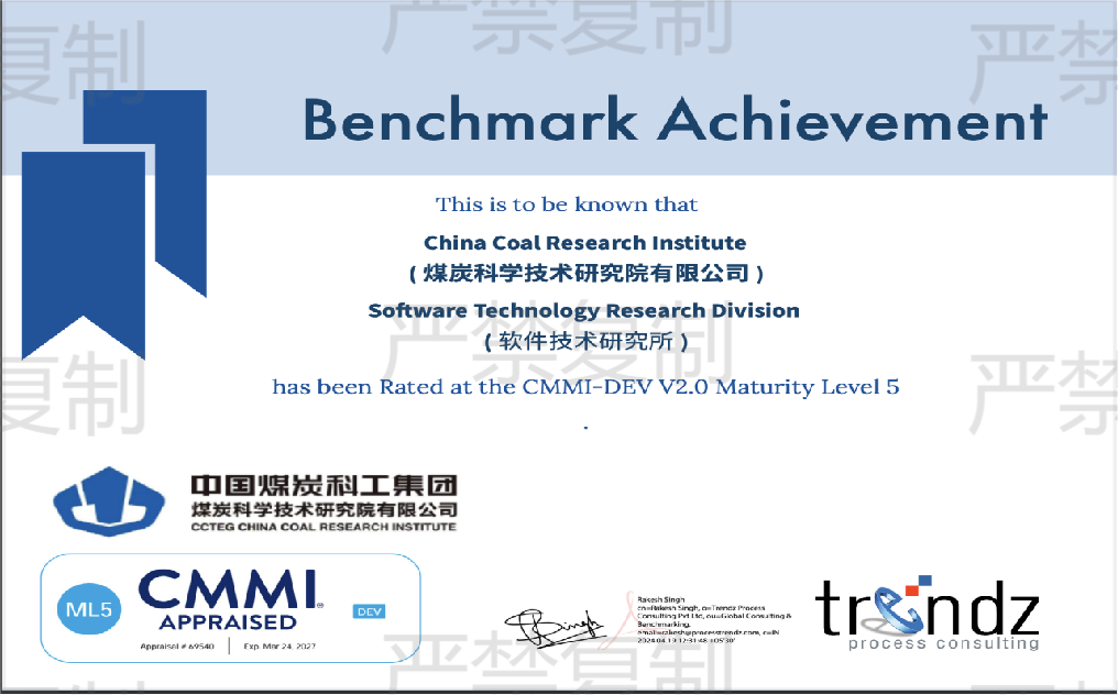 近年来,中国煤科煤科院软件技术研发团队紧抓煤炭行业加快建设煤矿新型信息基础设施的历史机遇,深耕互联网+、云计算、大数据、物联网、人工智能等新兴技术,在信息化领域不断取得新突破。由煤科院自主研发的智能矿山三维一体化管控平台、KJSNet煤矿复合灾害监测监控预警系统、智能矿山透明地质保障系统、煤矿灾害三维综合防治系统等软件产品先后在10余家大中型煤炭企业集团和13个省市监察局实现落地应用,均取得良好的经济效益和社会效益,为煤矿智能化建设与数字化转型提供了全面的技术保障。下一步,煤科院将以本次通过CMMI5级认证为契机,继续深入贯彻落实中国煤科“1245”总体发展思路,坚持创新驱动和做强主业战略,不断提升软件产品研发管理能力,持续加强研发管理体系和服务交付体系标准化、规范化、国际化,为实现煤矿数字化、智能化、绿色化升级发展贡献煤科力量。