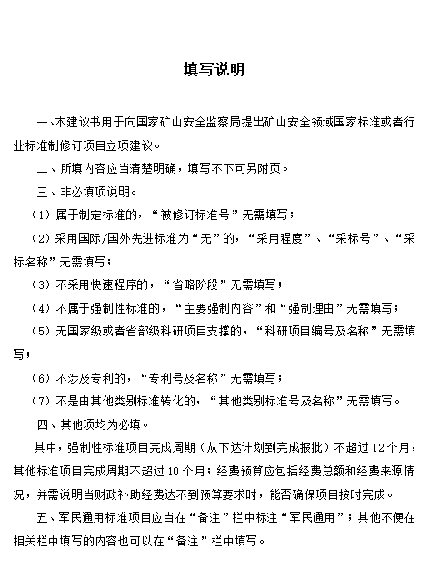 (二)申报材料。申报单位应当按照《矿山安全标准工作管理办法》规定的格式和要求报送项目汇总表(见附件1)、建议立项的书面意见、矿山安全标准项目建议书(见附件2)、标准草案,申报国家标准项目的,应当同时报送国家标准项目建议书(见附件3、附件4)。申报强制性国家标准的应当同时报送预研报告和项目论证会议纪要等材料。项目建议书电子版可在矿山安全标准服务平台“下载中心”栏目下载。