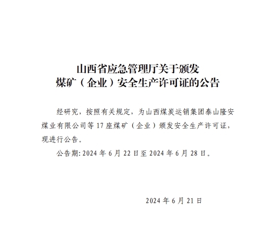 经研究,按照有关规定,为山西煤炭运销集团泰山隆安煤业有限公司等17座煤矿(企业)颁发安全生产许可证,现进行公告。