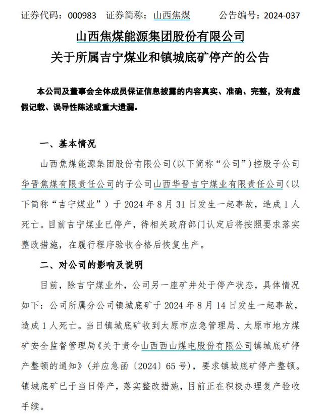 山西焦煤表示,目前,除吉宁煤业外,公司另一座矿井处于停产状态,具体情况如下:公司所属分公司镇城底矿于2024年8月14日发生一起事故,造成1人死亡。当日镇城底矿收到太原市应急管理局、太原市地方煤矿安全监督管理局《关于责令山西西山煤电股份有限公司镇城底矿停产整顿的通知》(并应急函〔2024〕65号),要求镇城底矿停产整顿。镇城底矿已于当日停产,落实整改措施,目前正在积极办理复产验收手续。
