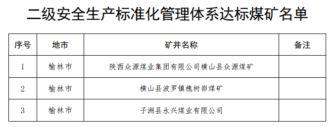 按照《煤矿安全生产标准化管理体系考核定级办法》及《陕西省煤矿安全生产标准化管理体系考核定级实施细则(试行)》(陕应急〔2020〕140号)规定,经资料审查、现场检查、网上公示,现对达到二级安全生产标准化管理体系的3处煤矿(名单见附件)予以公告,自公告之日起有效期3年,在有效期内享受《关于大力推进煤矿安全生产标准化建设工作的通知》(安监总煤行〔2017〕59号)有关激励政策。