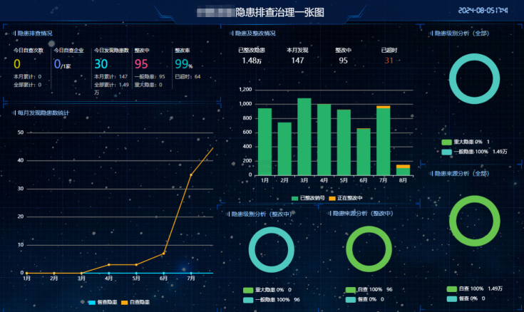 支持通过防爆终端进行移动违法违规行为检查,通过监管系统实现隐患上报、接单、整改、验收的闭环处置,并支持矿山企业现场作业审批等个性化功能扩展。同时,对安全检查发现的违法违规行为根据类型、等级及时间、空间等不同维度进行数据分析,对统计汇总数据进行可视化处理,辅助企业分析安全态势。