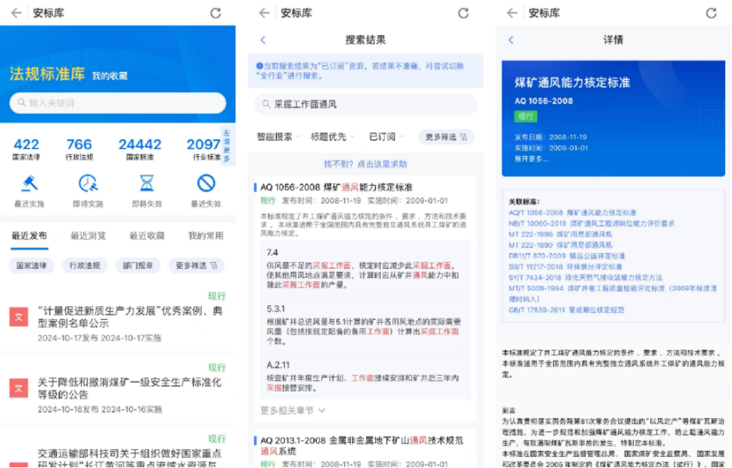 包括矿山、化工、电力等34万个标准、1.8万个法律法规,通过文本化、结构化处理,使用任意关键字,即可进行全文检索。云平台可实时推送最近发布、最近实施、即将实施、即将失效的法规标准清单,为企业建立统一的法规标准获取渠道。