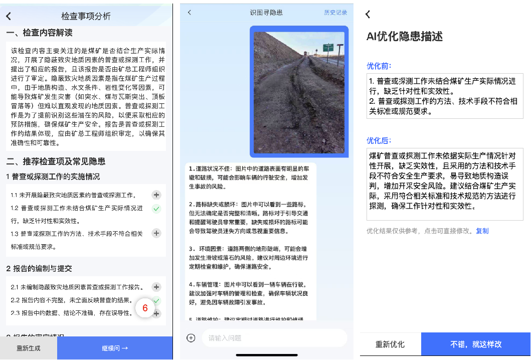 通过现场拍摄照片或视频,基于AI大模型自动识别安全隐患和违规行为,并输出可能违反的法规标准条目,通过连续问答方式,精准辨识问题隐患和违规详情并现场记录。