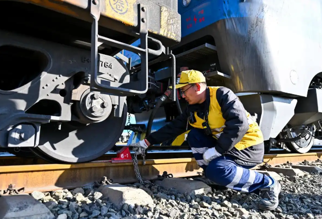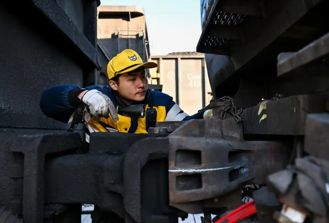 2月13日,工作人员在呼和浩特南站给运煤列车放防溜铁鞋。