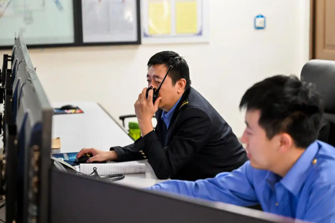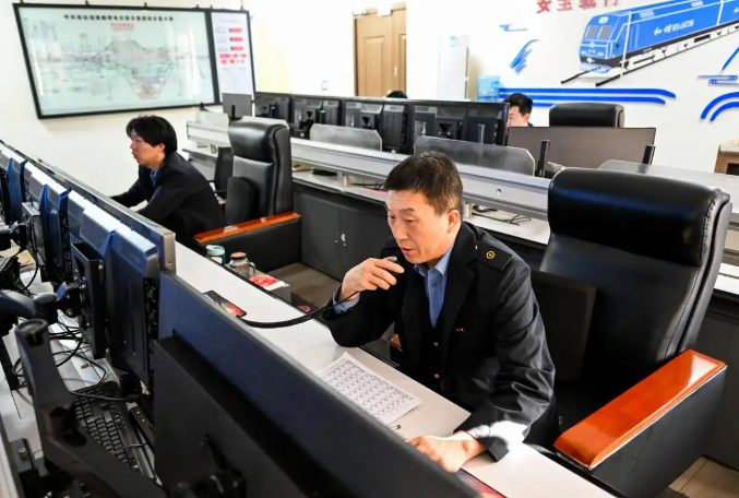 2月13日,工作人员在呼和浩特南站进行行车指挥。