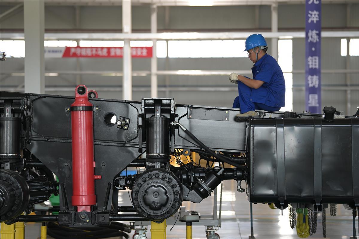 7月2日,在乌海铱钼新能源科技有限公司总装车间内,工人们正在组装EM186H型新能源智能矿用卡车。该卡车长12.5米、宽4.26米、高4.9米,采用8*6底盘架构和“燃油+电动”混联驱动模式,标准载重量为130吨。