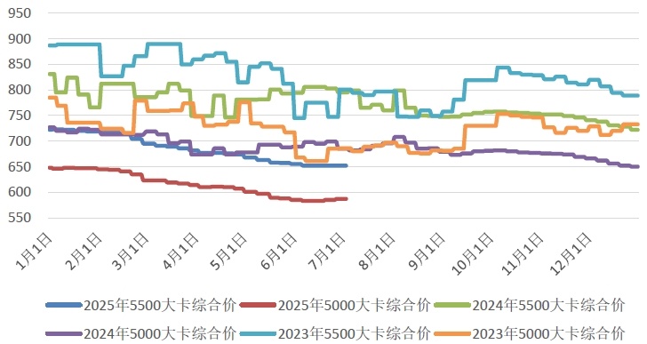 CECI进口指数本期,CECI进口指数到岸标煤单价741元/吨,较上期下降9元/吨,环比降幅1.2%。本期各煤种采购价格除太仓港(灵便型)3800千卡/千克价格上涨3元/吨和广州港(巴拿马型)5500千卡/千克价格上涨2元/吨外,均有不同程度下降,其中太仓港(灵便型)5500千卡/千克价格环比下降14元/吨,广州港(巴拿马型)3800千卡/千克价格环比下降2元/吨。本周,进口煤现货市场需求环比略有回升,但依旧处于低位,主要进口煤采购终端连续两周未开展大规模采购,仍以零散补库为主,现货交易市场货盘供应充足但成交寡淡。本期成交的交货期集中于7月下旬至9月上旬。从采购国别及结构来看,印尼NAR3800千卡/千克及以下热值的低硫煤资源占比接近85%。进口高卡煤市场走势分化,国内走势疲软,终端以观望为主;而日韩及欧洲日前需求较前期有所释放,短期内对国际市场价格有所支撑;从近期零星成交的货盘来看,8月交货期的澳洲、印尼的资源,5500千卡/千克、0.8以下硫份华南到岸价在630-638之间。