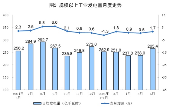 规上工业电力生产增速加快。6月份,规上工业发电量7963亿千瓦时,同比增长1.7%,增速比5月份加快1.2个百分点;日均发电265.4亿千瓦时。1—6月份,规上工业发电量45371亿千瓦时,同比增长0.8%,扣除天数原因,日均发电量同比增长1.3%。