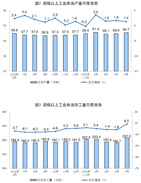 原油生产稳定增长。6月份,规上工业原油产量1820万吨,同比增长1.4%,增速比5月份放缓0.4个百分点;日均产量60.7万吨。