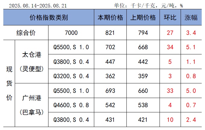 CECI沿海指数5500千卡/千克、5000千卡/千克现货成交价较上期分别上涨18元/吨、4元/吨。从样本情况看,5500千卡/千克、5000千卡/千克规格品现货成交价样本价格区间分别为682-705元/吨、627-630元/吨。从样本热值分布看,5500千卡/千克、5000千卡/千克、4500千卡/千克样本在总量中占比分别为25.9%、57.7%、16.4%。