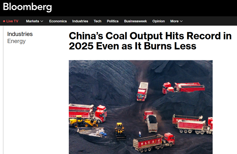 彭博社此前发文称,尽管由于清洁能源的大增,中国的发电厂减少了化石燃料的消耗,但根据此前公布的数据,即使在第二季度的安全检查导致产量下滑1.2%、火电发电量首次出现十年来年度下降的背景下,中国煤炭产量在2025年仍创下历史新高。