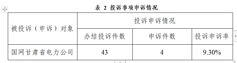 2025年12月,甘肃能源监管办接收申诉事项4件,甘肃能源企业办结投诉43件,投诉申诉率9.30%,全部为国网甘肃省电力公司。