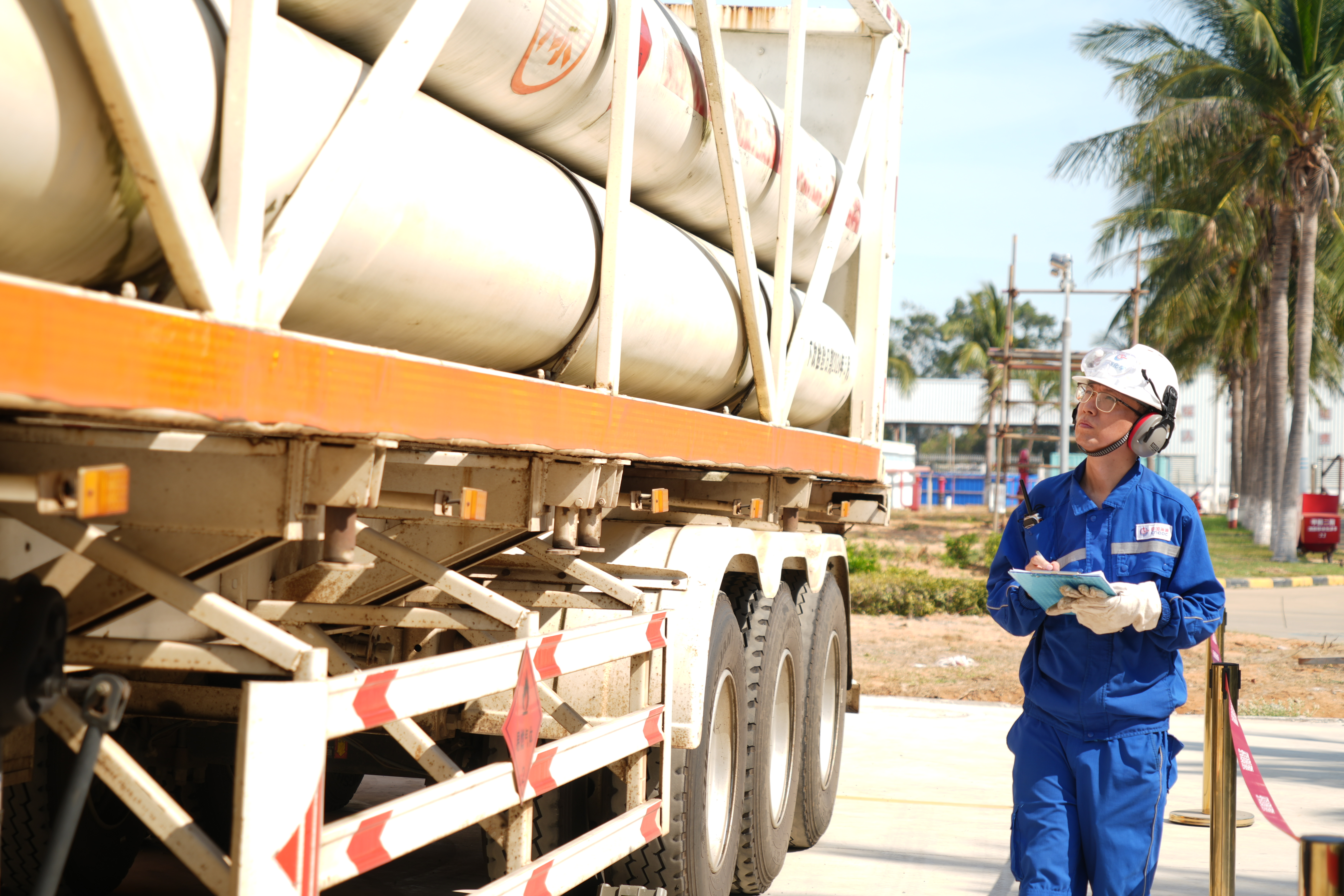 图为中国海油化学富岛公司工作人员正在检查生物质原料运输车。任志达摄