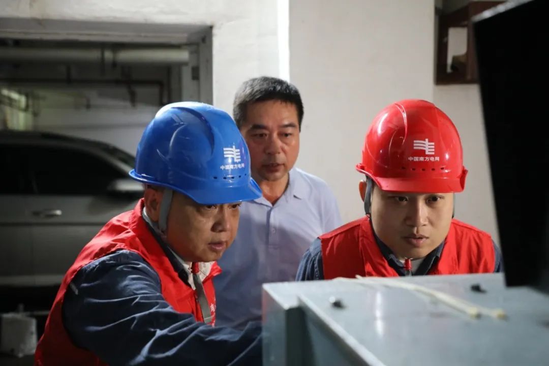 南方电网广东湛江赤坎供电局工作人员主动走访湛江市政府大楼等单位,对其供电设施、自备电源和应急处理措施等进行检查,提前对自备电源、抽水设备进行试运行。(列钊 摄)