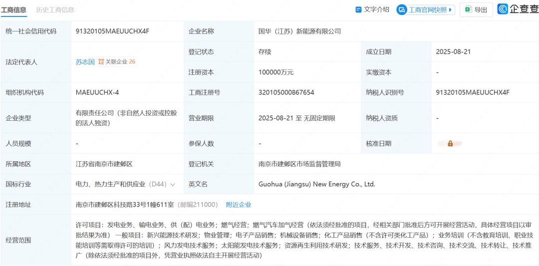 8月21日,国华(江苏)新能源有限公司注册成立,法定代表人为苏志国,注册资本为10亿元人民币。