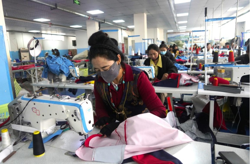 在穹鹏民族手工艺品基地,缝纫机的嗒嗒声此起彼伏,交织出一件件精美的手工藏式服饰、校服。