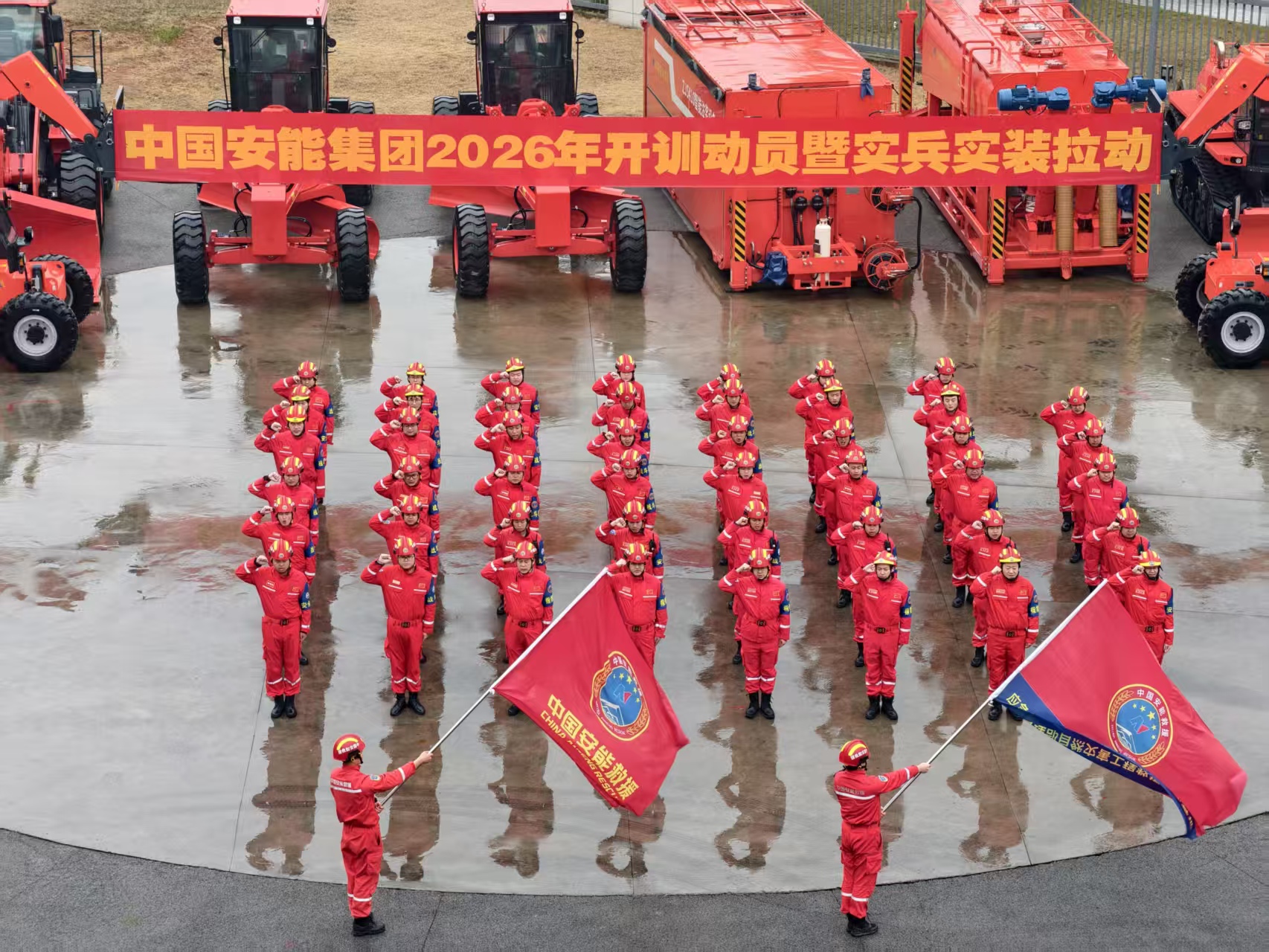 这是中国安能集团2026年度开训动员暨实兵实装拉动演练仪式中的一幕。本次演练是中国安能转企以来规模最大、要素最全、科技含量最高的实兵实装拉动演练。演练横跨白山黑水至云贵高原,灾种覆盖地震、洪涝、冰雪、滑坡、矿难等全要素,是中国安能锚定打造一流工程应急救援“野战军”、国家队战略目标的生动实践。