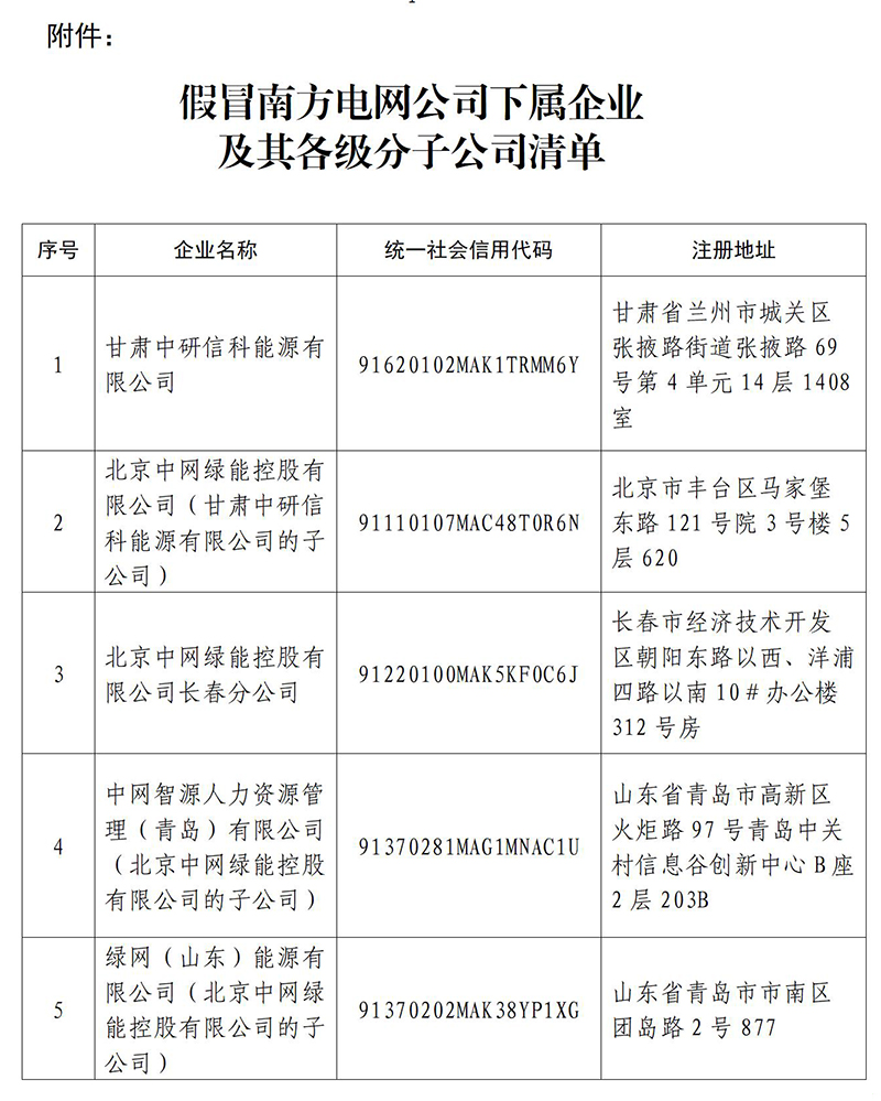 一、“甘肃中研信科能源有限公司”及下属“北京中网绿能控股有限公司”等各级分子公司(详见清单)与南方电网公司及下属企业无任何隶属或股权关系,其一切行为均与我公司无关。我公司已向市场监督管理部门举报,并向公安机关报案。