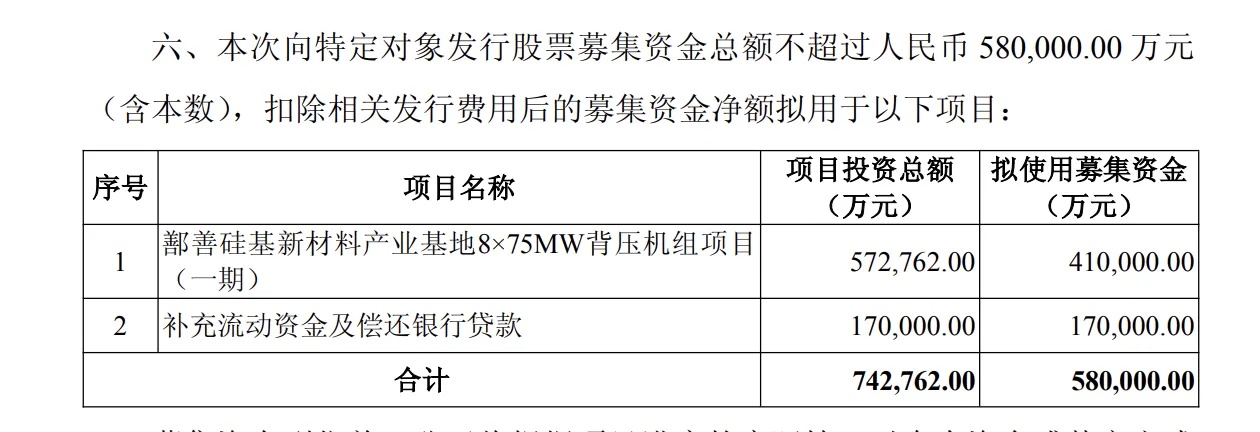 合盛硅业发布公告,拟定增募资58亿元,其中,41亿元用于建设鄯善硅基新材料产业基地8*75MW背压机组项目(一期),剩余17亿元用于补充流动资金及偿还银行贷款。