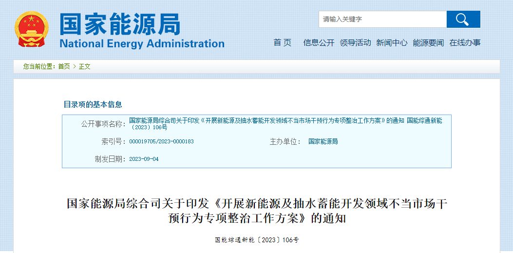 国家能源局综合司关于印发《开展新能源及抽水蓄能开发领域不当市场干预行为专项整治工作方案》的通知