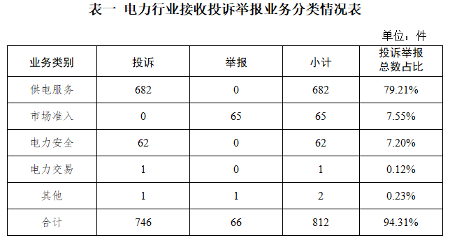 电力行业排在首位,数量为812件、占投诉举报总数的94.31%,主要集中在供电服务、市场准入、电力安全等方面。