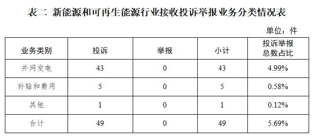 新能源和可再生能源行业排在第二位,数量为49件、占投诉举报总数的5.69%,主要集中在并网发电、补贴和费用等方面。
