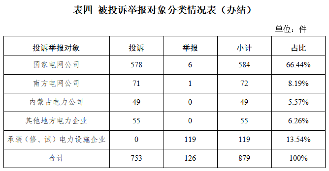 从被投诉举报对象看,供电企业760件、占投诉举报总数的86.46%,其中国家电网公司584件、占比66.44%,南方电网公司72件、占比8.19%,内蒙古电力公司49件、占比5.57%,其他地方电力企业55件、占比6.26%;承装(修、试)电力设施企业119件、占比13.54%。
